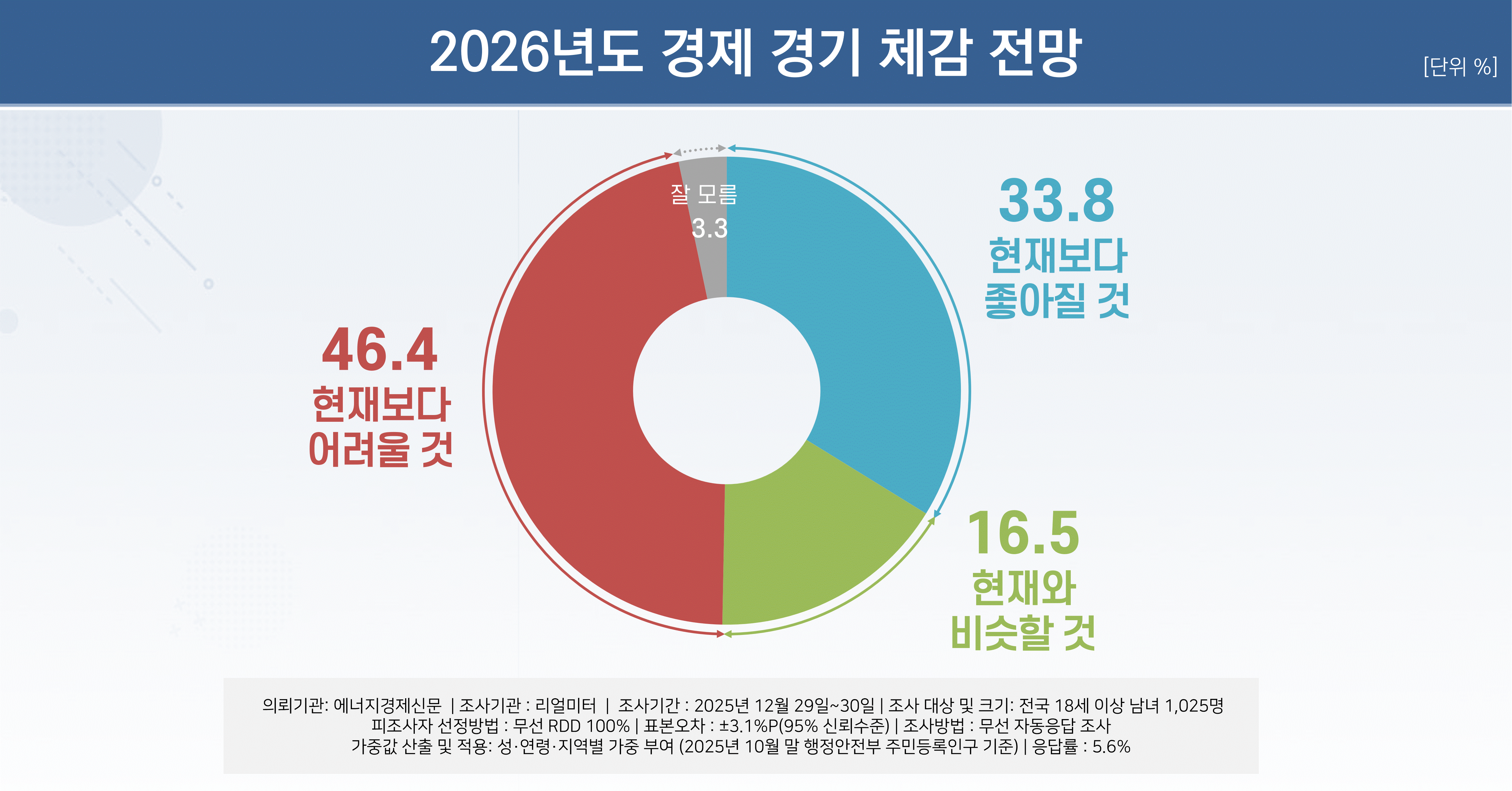 리얼미터가 에너지경제신문 의뢰로 실시한 ‘2026년 경기 전망 국민 인식 조사’ 결과, 국민 절반 가까이가 내년 경제를 부정적으로 내다보고 있는 것으로 나타났다.