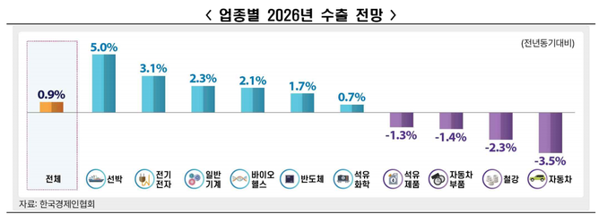 한국경제인협회(이하 한경협)가 시장조사 전문기관인 모노리서치에 의뢰하여 10대 수출 주력 업종을 영위하는 매출액 1,000대 기업들을 대상(150개사 응답)으로 「2026년 수출 전망 조사」를 진행한 결과, 응답 기업들은 2026년 수출이 올해 대비 0.9% 증가할 것으로 전망했다.