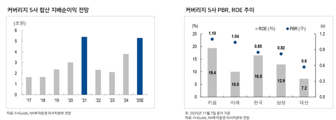 미래에셋증권은 상법개정안에 따른 기보유 자사주 1.1억주 소각이 기대된다. 한국금융지주는 밸류업에는 소극적이나 압도적으로 높은 ROE 창출 능력을 보유하고 있어 PBR 0.9배는 저평가 상태라 판단한다.