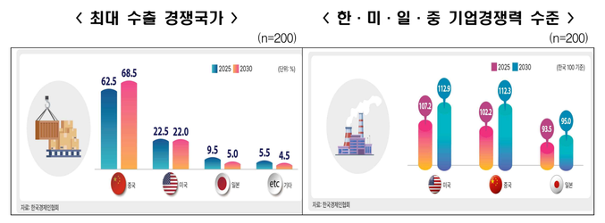 한국의 기업경쟁력을 100으로 가정하고 미국, 일본, 중국의 기업경쟁력 수준을 묻는 질문에 대해 기업들은 2025년 현재에는 ‣미국 107.2 ‣중국 102.2 ‣일본 93.5라고 응답했고, 2030년에는 ‣미국 112.9 ‣중국 112.3 ‣일본 95.0으로 전망했다.