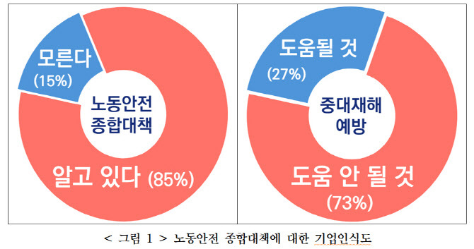 경총은 제조·건설업을 포함한 262개 기업을 대상으로 10월 22일부터 11월 5일까지 15일간 설문조사를 진행했다. 조사 결과 대책 내용을 알고 있다고 답한 222개 기업 중 73%에 달하는 162개 업체가 “중대재해 예방 효과가 없다”고 평가했다.