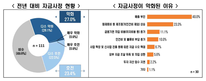응답 기업의 절반(49.6%) 가량은 올해 자금사정이 작년과 비슷한 수준이라고 응답했다. 작년보다 자금사정이 악화됐다고 응답한 비중은 27.0%로 호전(23.4%)됐다는 응답보다 높게 나타났다.