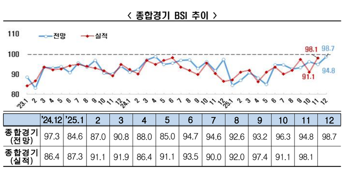 11월 BSI 실적치는 98.1로 2022년 2월(91.5)부터 3년 10개월 연속 부진이 이어지고 있다.