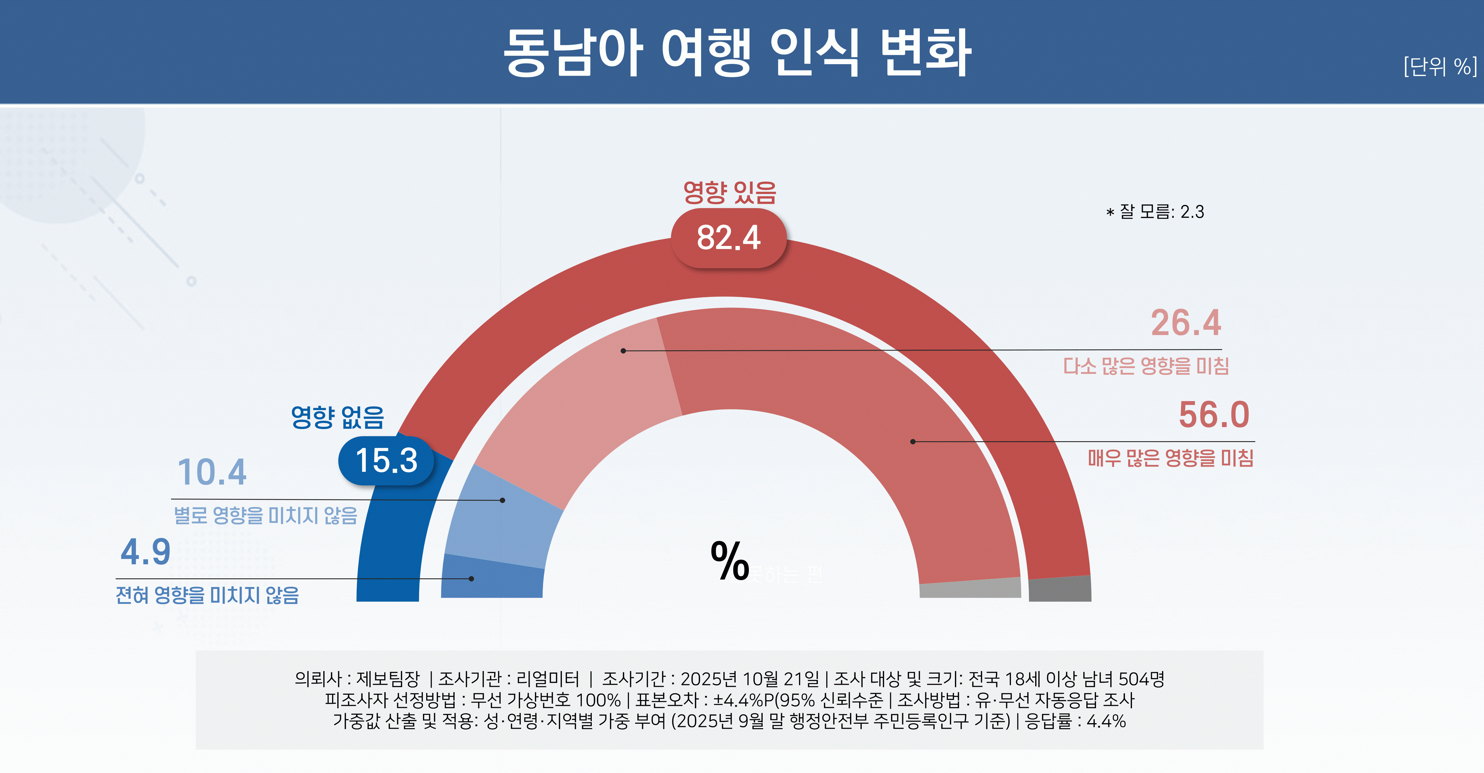 [팩트UP=이세라 기자]최근 캄보디아 등 동남아 국가에서 한국인을 대상으로 한 범죄가 발생하며 동남아 국가에 대한 여행 수요에 심각한 영향을 미칠 것으로 예상됐다. 리얼미터가 지난 10월 21일, 전국 만 18세 이상 남녀 504명을 대상으로 한 조사에서 캄보디아에서 발생한 범죄 사태가 동남아 국가 해외여행에 대한 인식 변화에 얼마나 영향을 미쳤는지 물은 결과, 10명 중 8명 이상(82.4%)이 영향을 미쳤다고 응답했다. 특히 만 18~29세 청년층에서는 88.3%로 나타나 다른 연령대 대비 가장 높은 비율을 보였다. 이번 사건으로 우리 정부 대응 또한 화두가 되고 있다. 자국민을 대상으로 한 범죄에 어떤 대응 방식을 취하는 것이 바람직한지 물은 결과, ‘현지 정부와 협력 및 공조 수사에 집중’이란 의견이 34.7%로 가장 많았고, 이어 ‘외교 채널을 통한 강력 항의 및 재발 방지 협약 추진’이 27.5%로 나타났다. ‘군사작전 등 강력한 조치’가 필요하다는 의견 역시 25.2%로 적지 않은 비율을 보였다. 외교부의 초동 대응 역시도 절반 이상인 56.0%가 잘못했다고 응답해, 잘했다는 응답(35.9%) 대비 18.6%포인트 앞서는 것으로 집계되었다. 더불