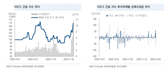 지난 1일부터 5일 WICS 건설 지수는 +7% 상승 마감했다. 특히 중소형 건설주의 강세가 두드러졌으며 같은 기간 상지건설(+114%), 동신건설(+81%), 일성건설 (+70%) 등 급등했다.