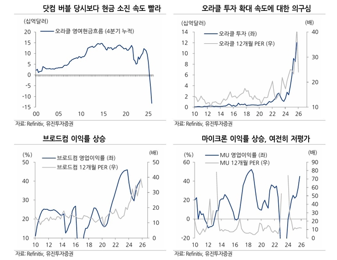 그러나 오라클의 잉여현금이 소진이 되는 속도는 매우 가파르다. 연간 200%를 넘어가는 오라클의 투자 속도가 둔화되면 AI 업체들의 전반적인 밸류에이션에도 영향을 미칠 수밖에 없다. 이러한 AI 투자 지속성에 대한 우려는 데이터센터 투자를 중심으로 올랐던 글로벌 증시에 부담이 될 수 있다.