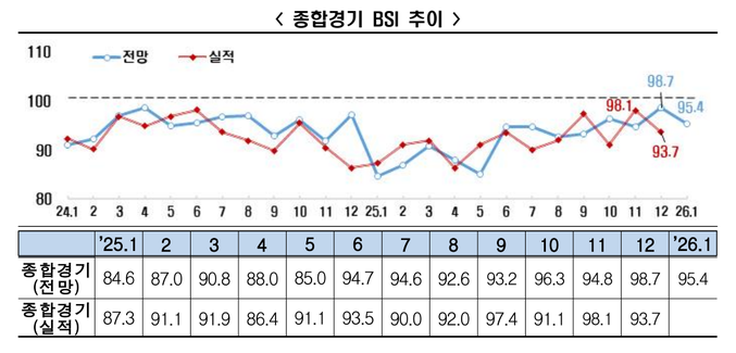 업종별로는 제조업(91.8)과 비제조업(98.9) 모두 부진할 것으로 전망됐다. 제조업 BSI(91.8)는 2024년 4월부터 1년 10개월 연속 기준치를 하회했다. 2025년 12월(105.2) 기준선 100을 넘어섰던 비제조업 BSI는 2026년 1월 98.9로 전망되면서 한 달 만에 기준선 아래로 내려왔다.