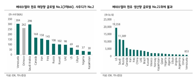 [하나증권=윤재성 연구원] 베네수엘라는 원유 매장량 글로벌 No.1(3.04억bbl)으로 No.2 사우디(2.98억bbl)를 근소하게 앞선다. 반면 실제 생산량은 100만b/d 내외로(글로벌의 1%, 사우디의 8%) 21위 불과하다. 참고로 매장량의 87%(262억bbl)을 차지하는 오리노코지대(Orinoco Belt)가 생산량의 60% 내외다.