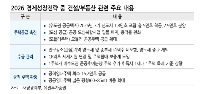 [유진투자증권=류태환 연구원] 정부가 발표한 2026년 경제성장 전략에서 건설 부문은 성장률을 끌어올릴 정책 수단보다는 거시 안정성 차원에서 관리해야 할 영역으로 다뤄졌다.