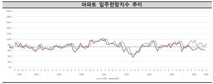 주택산업연구원이 주택사업자를 대상으로 설문 조사한 결과, 1월 전국 아파트 입주전망지수는 85.1로 전월 대비 9.6포인트(p) 상승한 것으로 조사됐다.
