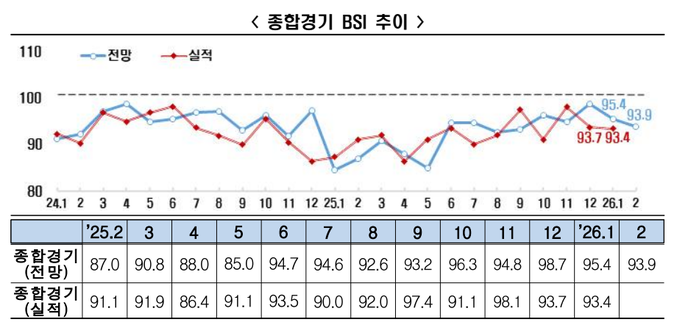 1월 BSI 실적치는 93.4로 2022년 2월(91.5)부터 4년 연속 부진이 이어지고 있다.