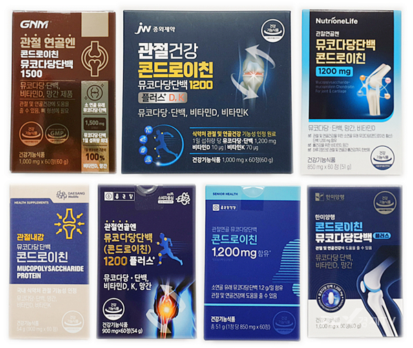GNM자연의품격 관절 연골엔 콘드로이친 뮤코다당단백 1500, JW중외제약 관절건강 콘드로이친 뮤코다당단백 1200 플러스 D, K, 뉴트리원 관절연골엔 뮤코다당단백 콘드로이친, 대상웰라이프 관절내강 뮤코다당단백 콘드로이친, 종근당 관절연골엔 뮤코다당단백(콘드로이친) 1200 플러스, 종근당건강 관절연골 뮤코다당단백 콘드로이친, 한미양행 콘드로이친 뮤코다당단백 플러스 (제품명 가나다순)
