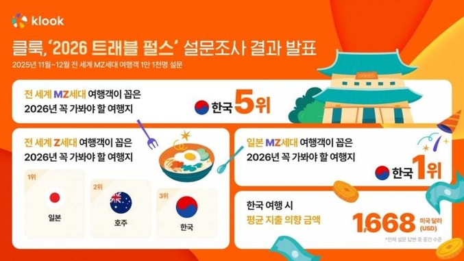 글로벌 여행 플랫폼 클룩은 '2026 트래블 펄스' 설문조사 결과 한국이 '2026년 꼭 가봐야 할 여행지' 종합 5위를 기록했다고 23일 밝혔다. Z세대만 보면 한국은 일본과 호주에 이어 3위다.