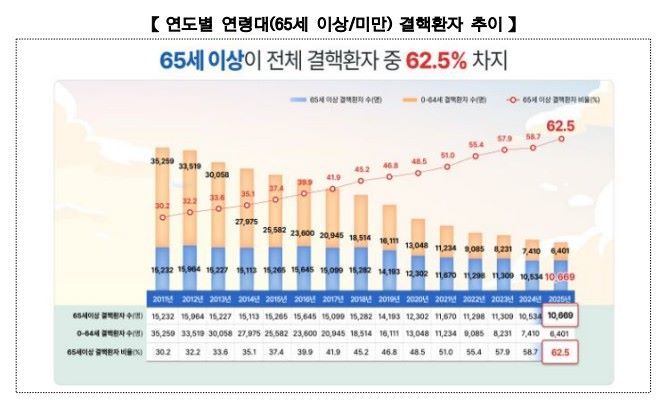 반면, 2025년도 65세 이상 결핵환자는 10,669명으로 전년 대비 1.3%(135명) 증가했다. 이는 고령화에 따른 65세 이상 인구 증가 영향으로, 인구 10만 명당 발생률은 101.5명으로 전년 105.8명 대비 4.1% 감소했다.