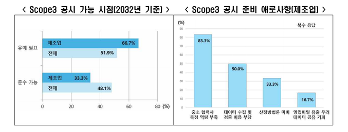특히 제조업은 3곳 중 2곳(66.7%)은 유예가 필요하다고 응답했다. 가장 큰 이유로 ‘협력사의 측정역량 부족과 데이터 신뢰성 저하(83.3%, 복수응답)’를 가장 큰 걸림돌로 꼽았다.