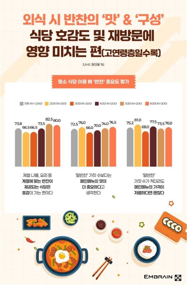 엠브레인 트렌드센터 관계자는 “소비자 다수는 반찬을 별도의 부가 서비스가 아니라 메인 메뉴 가격에 이미 포함된 기본 구성으로 인식하고 있었고, 무료 반찬 서비스 역시 한국 외식 문화의 정체성으로 받아들이는 경향이 강했다”고 말했다.