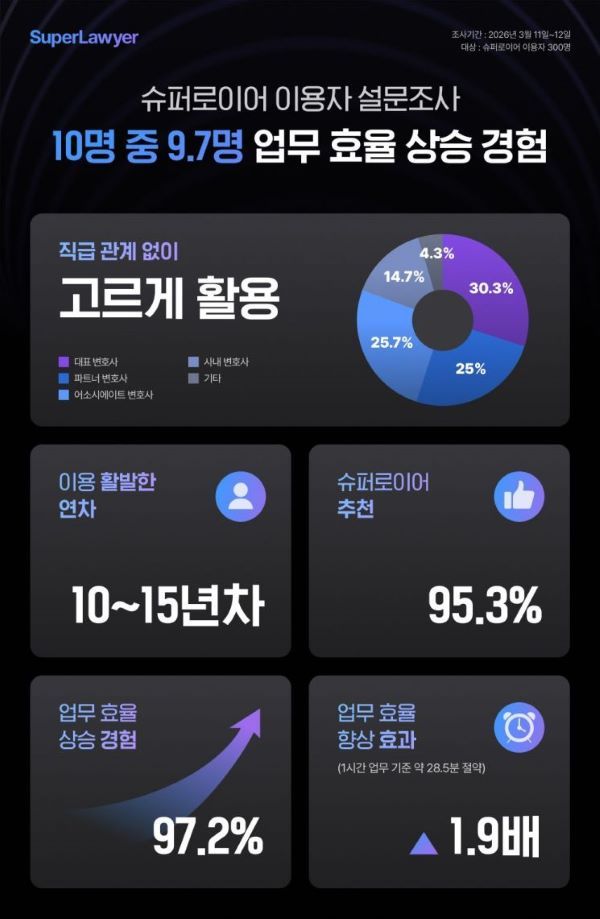 이번 설문조사는 슈퍼로이어에 대한 회원 만족도 향상을 위해 이용 현황을 파악하고, 최근 법조계 AI 기술 활용에 대한 관심이 높아지면서 법률 분야 AI 활용에 대한 법률전문가의 인식을 확인하기 위해 기획됐다. 조사는 지난 11~12일까지 양일간 진행됐으며, 슈퍼로이어 이용자 300명이 설문에 참여했다.