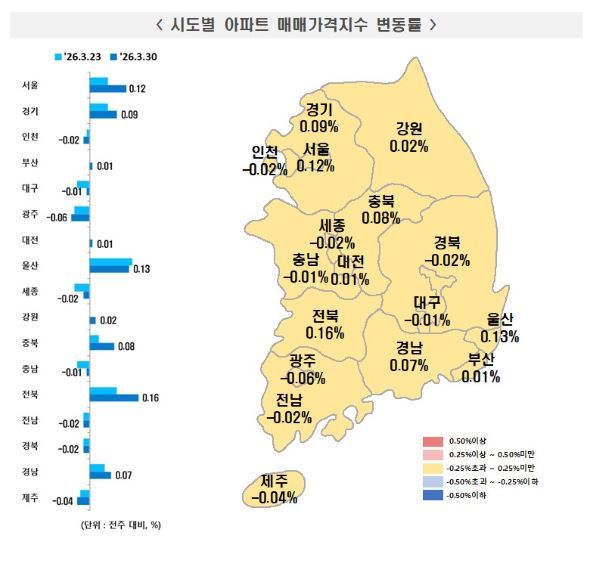 한국부동산원이 발표한 3월 다섯째 주(3월30일 기준) 주간 아파트 가격 동향에 따르면 서울 아파트 매매가격은 직전 주 대비 평균 0.12% 상승했다.