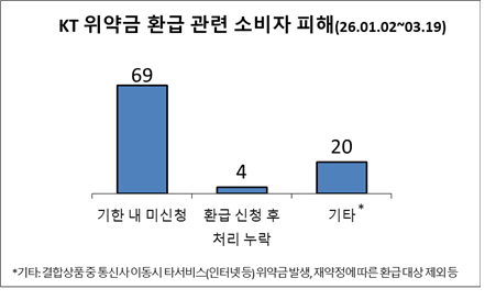 한국소비자연맹은 올해 1월부터 지난 19일까지 1372소비자상담센터에 접수된 KT 해지 위약금 관련 상담 93건을 분석한 결과 상담 사례 93건 중 ‘기한 내 미신청’이 69건으로 집계됐다고 밝혔다. 환급 신청 후 처리 누락은 4건, 결합 상품 이용 중 통신사 변경 시 타 서비스 위약금 발생 등 기타도 20건으로 조사됐다.