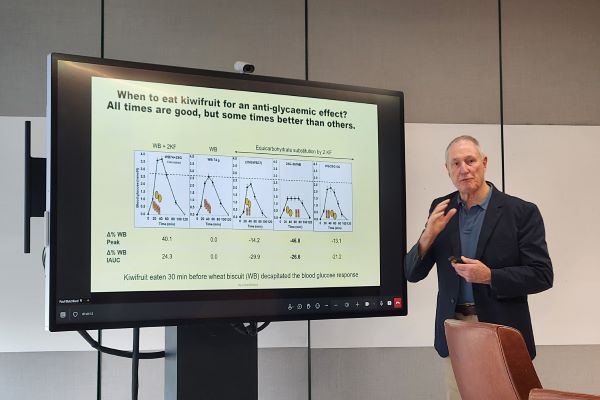 존 먼로 박사는 ‘키위에 함유된 식이섬유가 장 건강에 미치는 영향’을 주제로 발표에 나섰다. 그는 키위의 수용성 식이섬유 성분인 펙틴이 장 내에서 변의 부피를 늘리고 원활한 배변 활동에 도움을 줄 수 있다고 설명했다. 단, 키위를 갈거나 즙을 내는 등의 가공 과정을 거치면 펙틴이 파괴될 수 있어 원물로 섭취할 것을 강조했다. 또한, 키위를 식사 30분 전에 섭취했을 때 혈당 반응 완화 효과가 두드러지게 관찰된 연구 결과도 주목받았다.