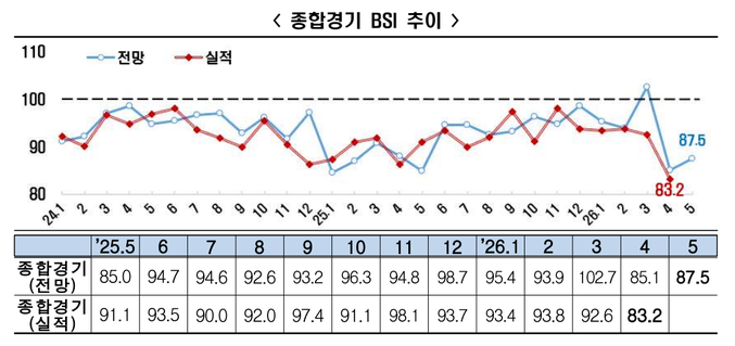 한편, 4월 BSI 실적치는 83.2로 조사됐다. 이는 코로나19 팬데믹 당시였던 지난 2020년 8월(79.8) 이후 5년 8개월 만에 가장 낮은 수치다.