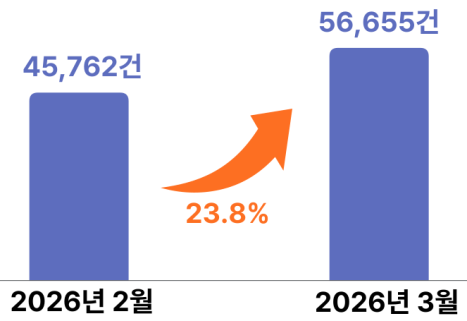 2026년 3월 접수된 소비자상담은 총 56,655건으로 전월(45,762건) 대비 23.8% (10,893건), 전년 동월(50,613건) 대비 11.9%(6,042건) 증가했다.